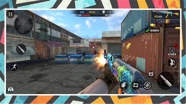 3、左侧轮盘控制角色移动,右侧控制瞄准以及射击,更有跳跃、手雷、医疗包的战术动作使用。