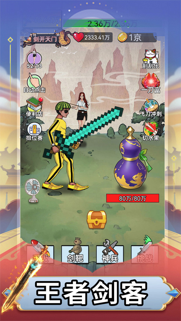 我功夫贼6是一款点击玩法的功夫休闲游戏,你将扮演一名剑客,踏上一条与众不同的冒险之路。你的任务是挑战各路高手,只需快速点击屏幕,你的出剑速度就会随之飙升!你遇到的对手绝非寻常人物,各类脑洞大开的角色将轮番登场。击败强大BOSS,获取那些造型离谱的强力武器,丰富的搞笑剧情与魔性场景,将为你带来前所未有的解压体验。