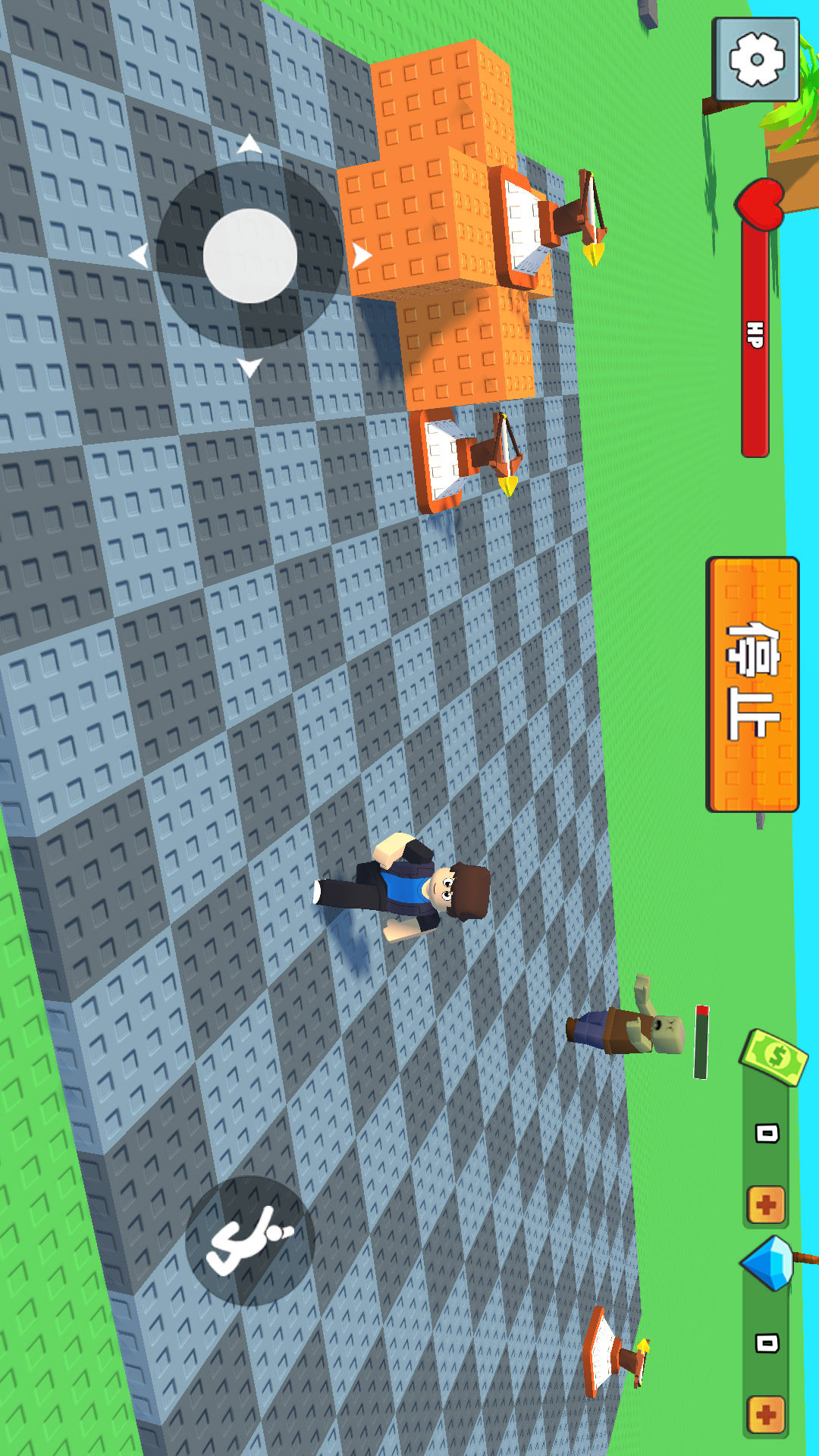 1、进入游戏,控制游戏中的角色跟着箭头开始移动,前往箭头所指的地方购买木头建造房屋。