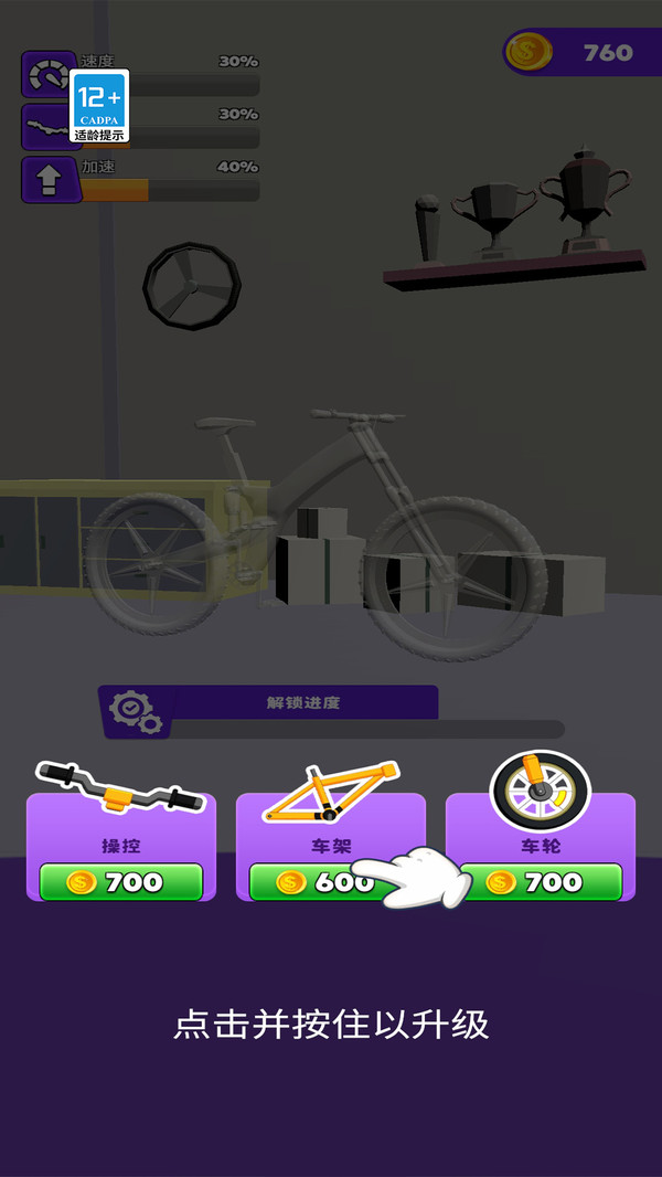 3、用每场比赛后获得的奖金和经验来提升自行车属性、解锁新零件或购买外观饰品,使角色与车辆共同成长。