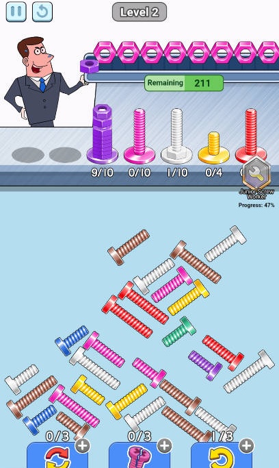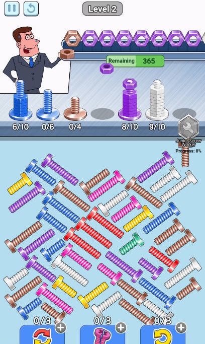 3、优先消除靠近边缘或易形成连消的螺丝,但需合理分配使用时机,提升闯关的效率。