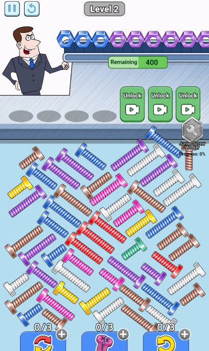 3、加入了消除元素,当玩家集满3个同色螺丝时,可以消除一个盒子,更加具有挑战性。