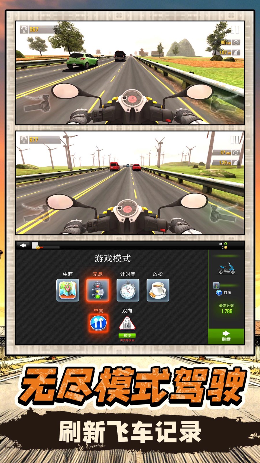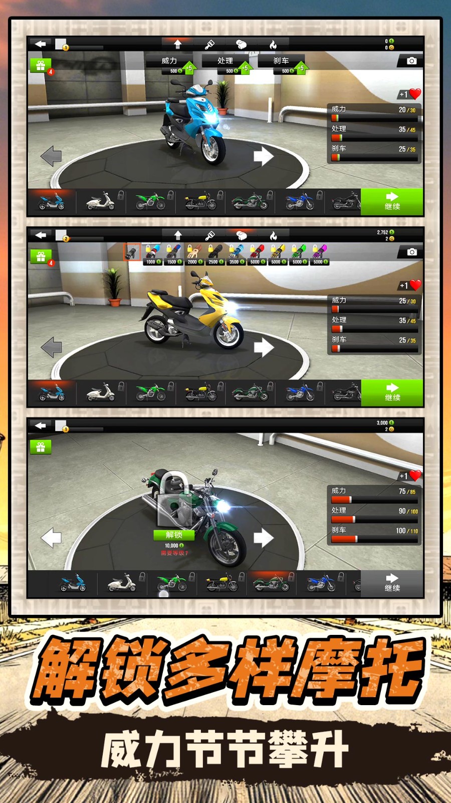 1、进入游戏可以选择不同的摩托车,开启精彩的竞速对决。