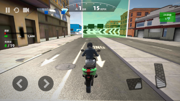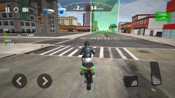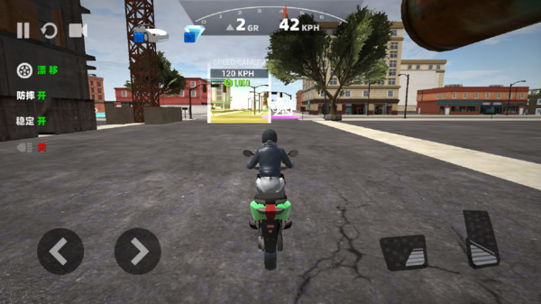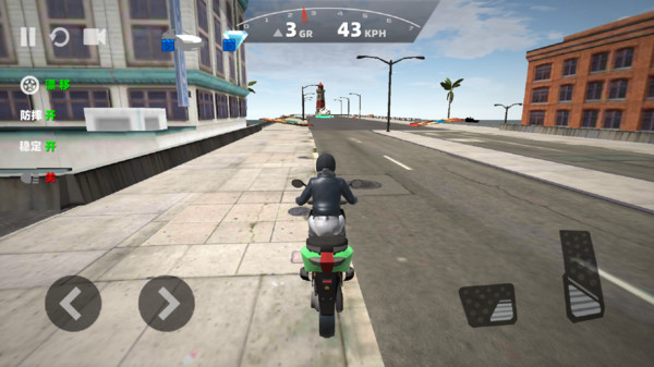 3、左侧按键控制摩托车移动方向,右侧控制油门以及刹车,在城市地图中自由驾驶。