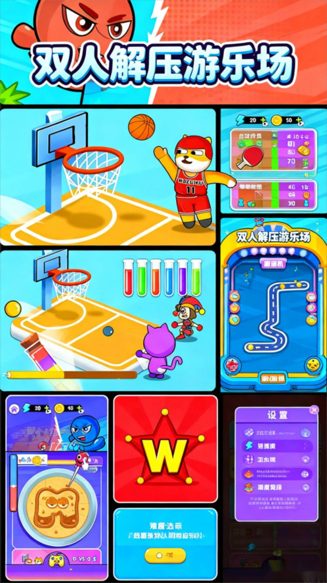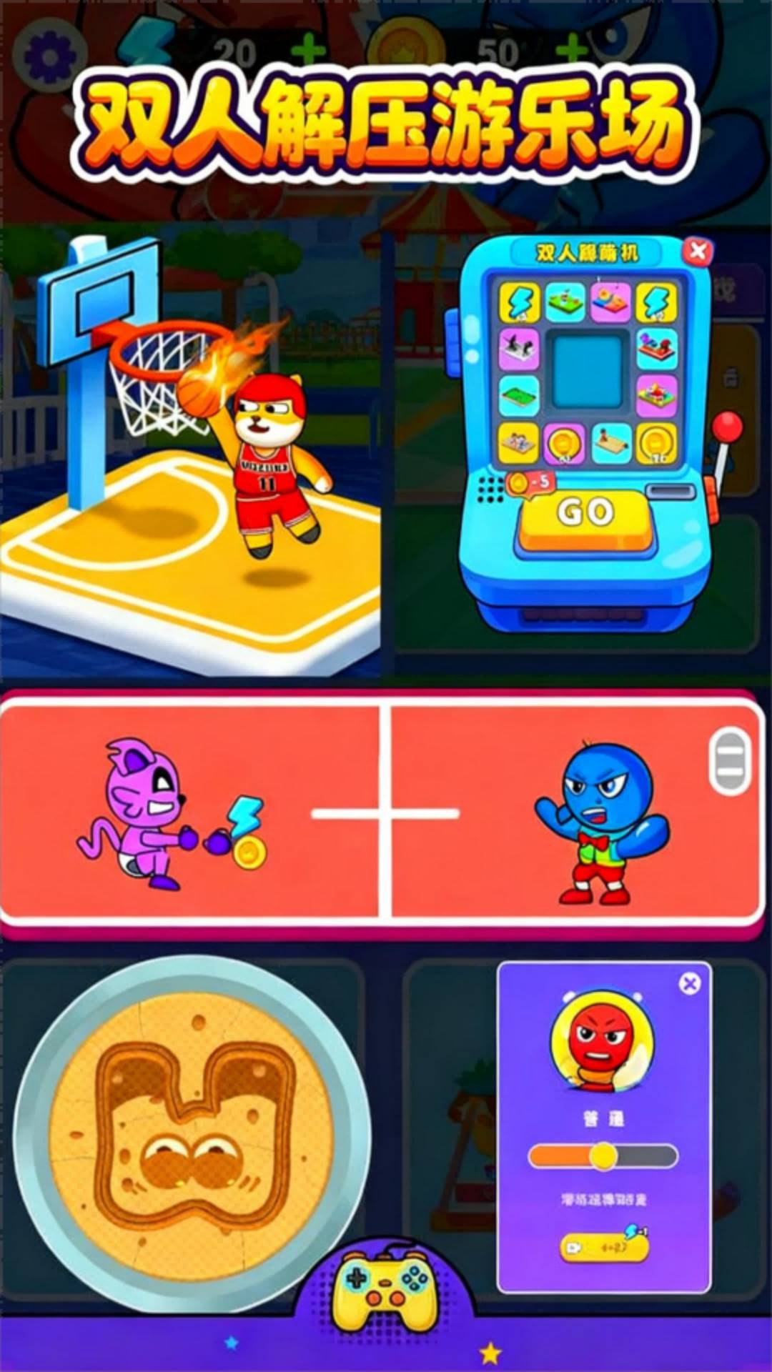 双人解压游乐场是一款专为好友、情侣或家人打造的亲密互动解压游戏合集,带来前所未有的同屏欢乐体验。游戏内汇集了数十款轻松有趣的创意小游戏,如指尖对战捏泡泡、抢夺甜蜜蛋糕、合力拆解迷你小屋等,每一款都强调双人协作或对抗的趣味性。通过简单直观的操作,玩家能在轻松氛围中释放压力,增进感情。高清3D画面搭配生动音效,让每一次触碰都充满反馈感。无论是周末休闲还是聚会助兴,只需一部设备,两人并肩而坐,即可开启一段充满笑声的互动时光。无需联网,随时随地畅玩,是拉近彼此距离的绝佳选择。