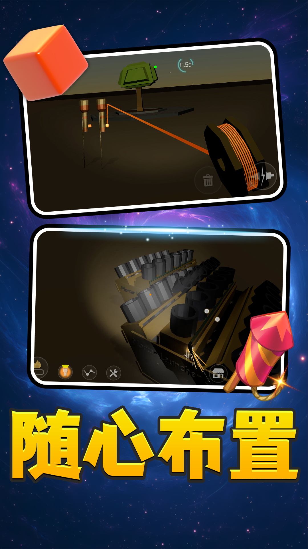 1、支持自由组合烟花,通过调整颜色、大小、发射角度、时间顺序,创造个性化表演;