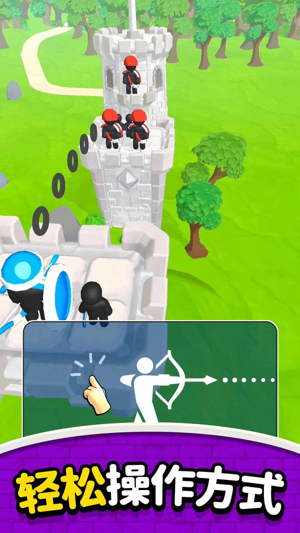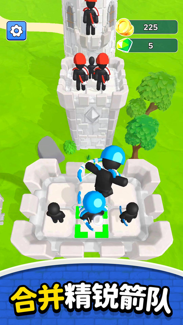 2、点击添加弓箭,移动合成相同的弓箭,射击对方的城堡,守卫家园安全。