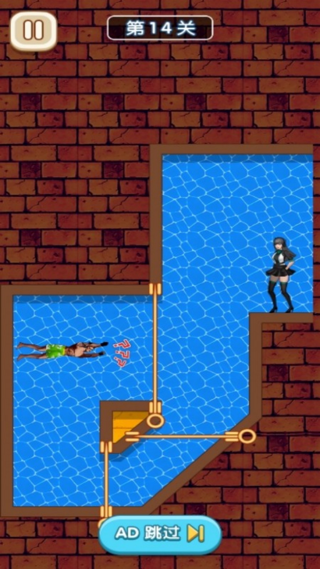 3、抽掉挡在角色前的木棍,调整拉针顺序,让水流冲开障碍物,同时避免角色被淹没。