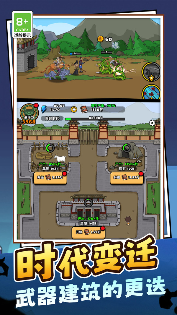 2、没有固定的通关阵容,不同的时代升级路线、兵种搭配和塔防布局组合都不同,使得每一局游戏都是全新的策略挑战。