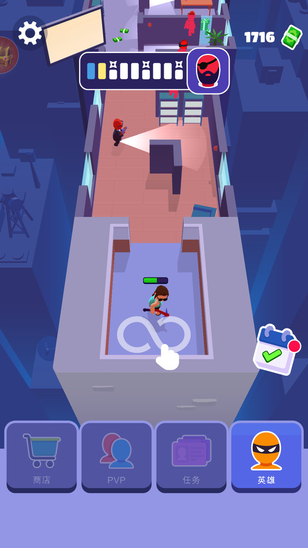 2、点击屏幕滑动,控制忍者角色移动,躲避敌人视野进行暗杀挑战。