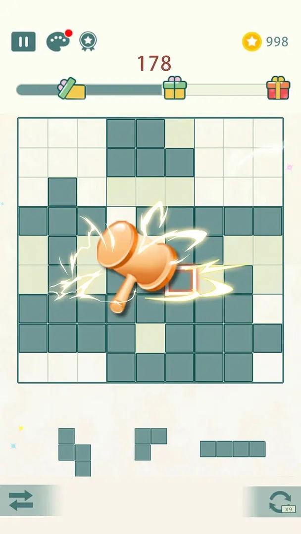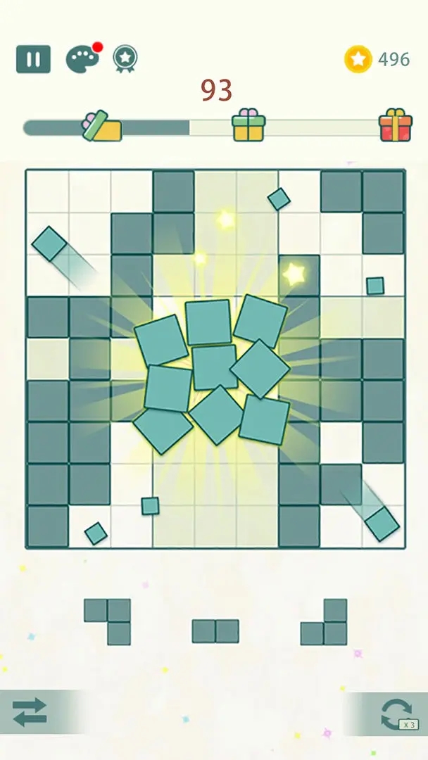 2、一个精妙的放置,可能同时满足两到三个九宫格的完成条件,从而触发华丽的连锁消除,一次性清空大片区域,并获得巨额奖励;