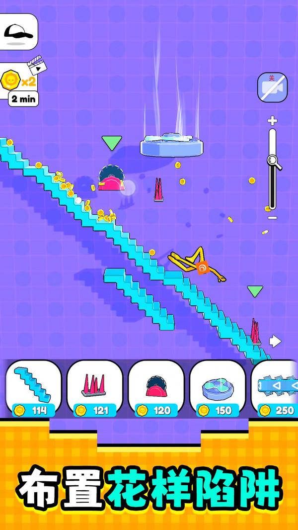 2、小人角色会不断的从高空向下坠落,在路径上布置陷阱获得金币。