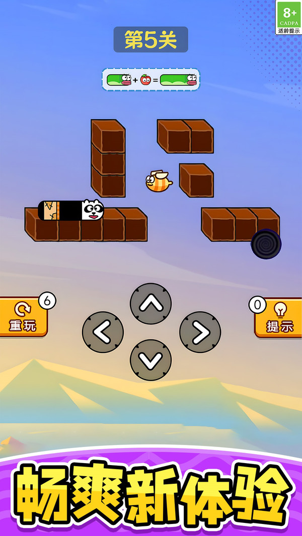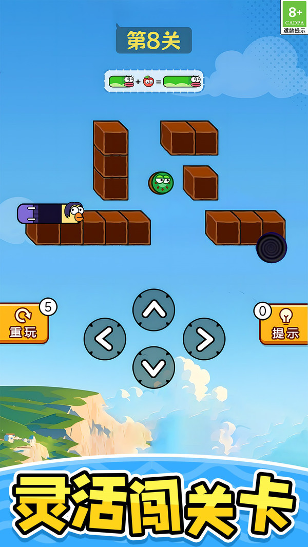 蛇蛇世界闯关是以贪吃蛇为核心的吞食闯关游戏,通过操控蛇体吞噬苹果、躲避障碍完成关卡挑战,玩家通过方向键或触控操控蛇体移动,吞噬场景中的苹果后蛇身增长,需在限定步数或时间内让蛇体进入黑洞完成传送,跌落悬崖或陷入死胡同则闯关失败,蛇体可进行折叠、倒立等变形动作,利用场景中的石块吞食,成功过关,变成最强蛇蛇。