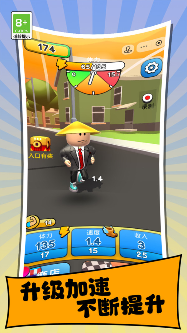 1、不断的点击屏幕,来让角色奔跑,获得金币收益。