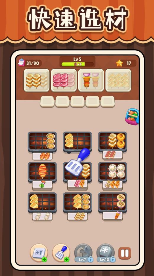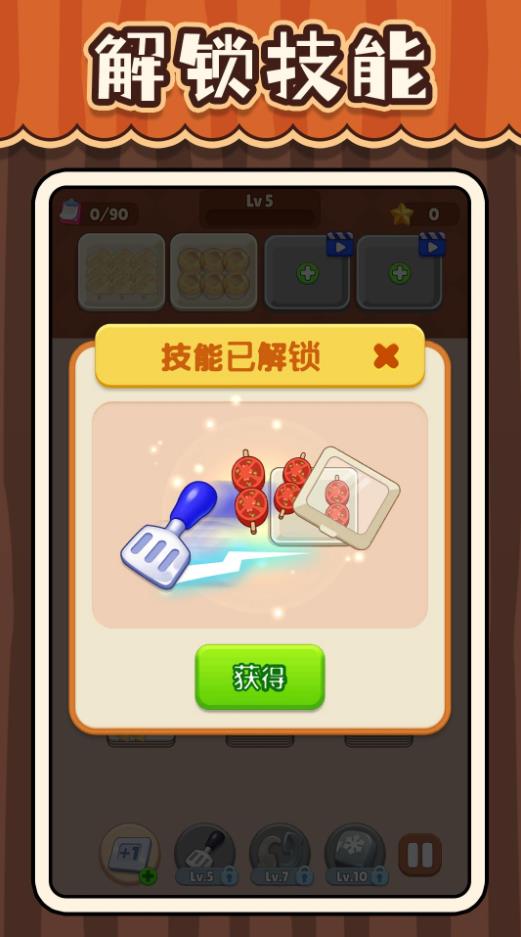 2、不断挑战提升等级,解锁强力技能,以及传说级的烤架和厨具,让你的摊位日益壮大。
