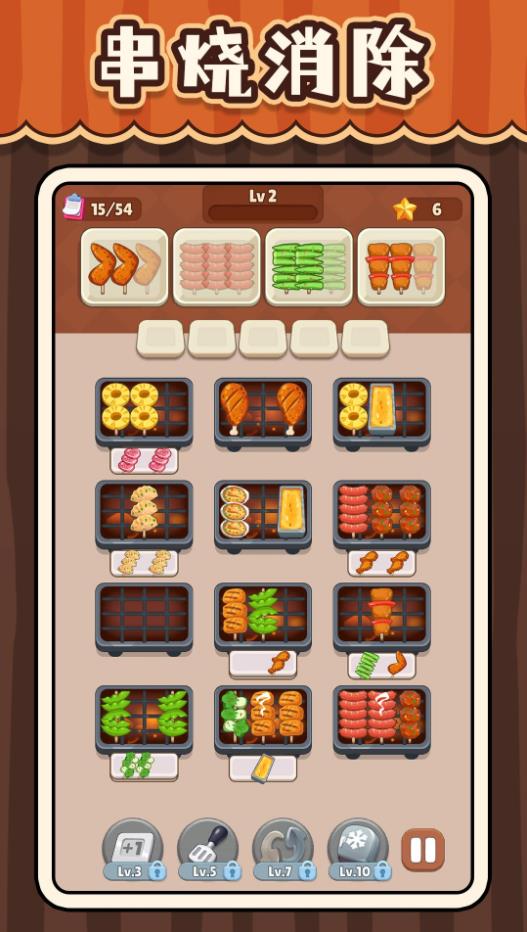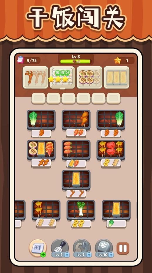 超级干饭人是一款轻松游戏的消除游戏,大量不同的关卡,每一关都是包含了很多不同的烧烤种类,玩家要做的事情就是找到三个一样的放置在一起,这样就能顺利消除,可以把不需要的种类放置在一边,不过要注意的就是,不能够超过一定的数量,不然就算你挑战失败,仔细观察,合理安排,按照相应的顺序进行消除,这样才能更加容易完成,快来进行尝试吧!