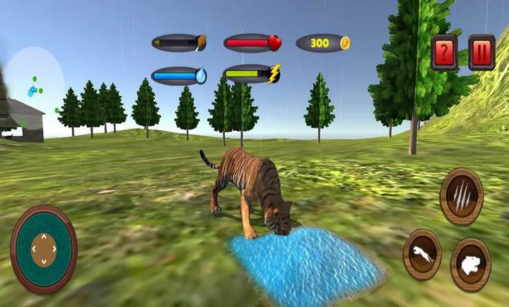 1、通过虚拟摇杆控制老虎移动,利用草丛掩护接近猎物,伺机发动突袭完成捕杀。