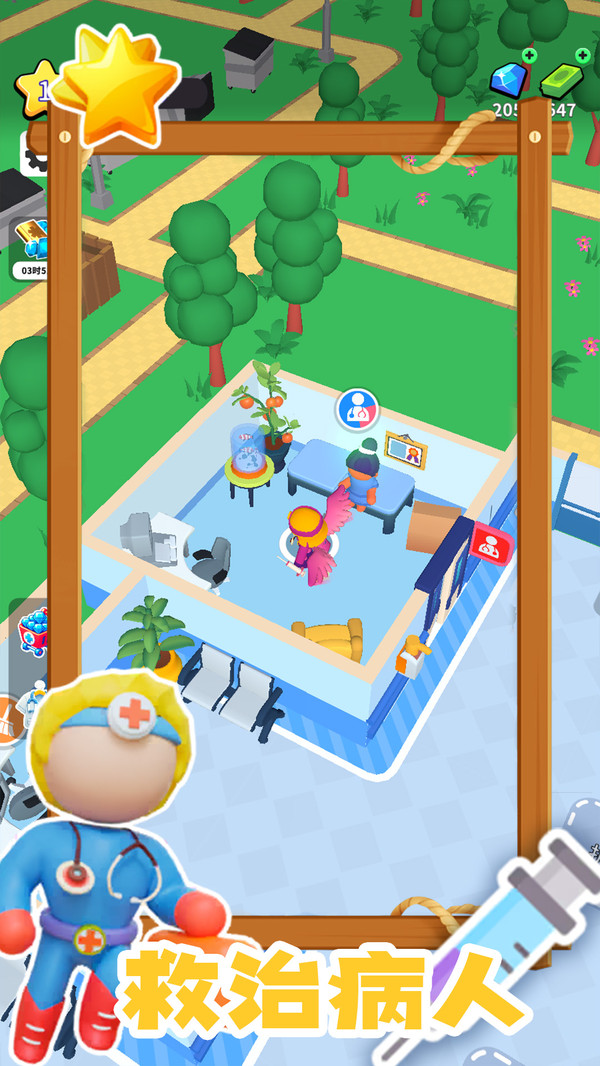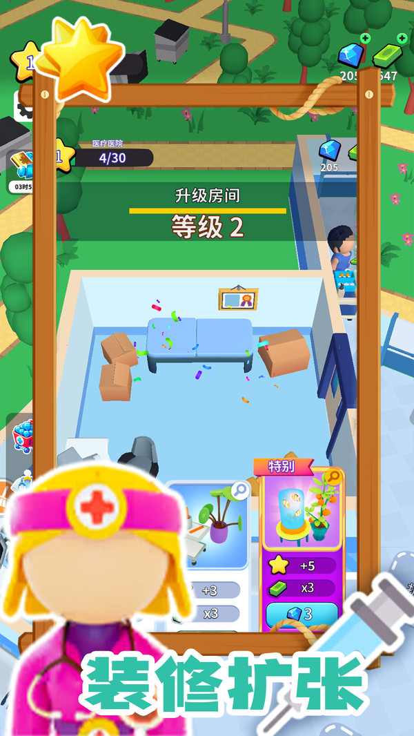 2、建造新的房间,安置好每个患者,获取丰富的钞票,扩大你的医院规模。