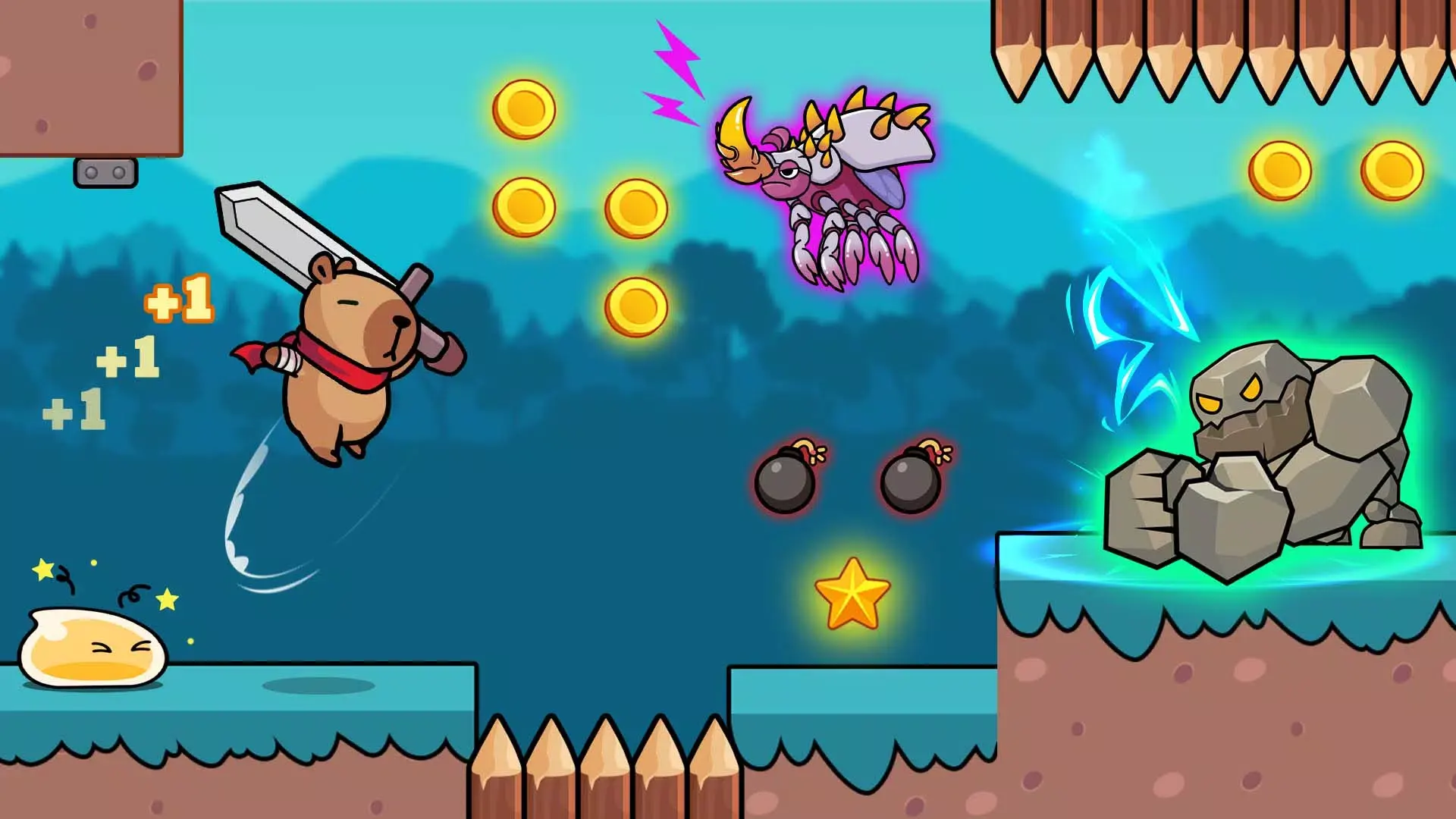 1、点击屏幕控制水豚跳跃,滑动实现二段跳或空中转向,避开地面陷阱。