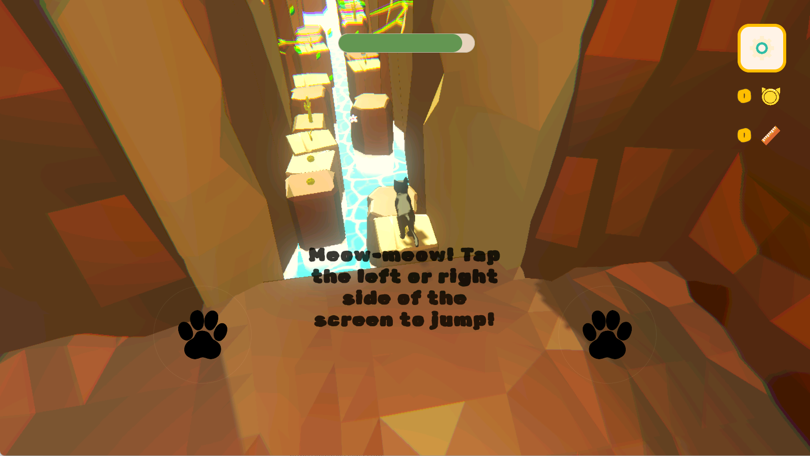 1、通过简单的触控操作控制黑猫前进,向上滑动屏幕让猫咪进行跳跃以避开地面陷阱。