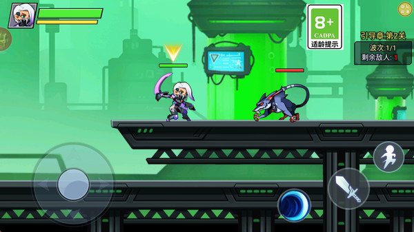2、点击左侧轮盘滑动可以左右移动,右侧控制跳跃攻击以及各类技能释放。
