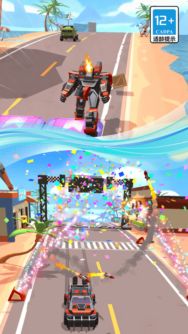 1、基本玩法为驾驶赛车竞速攻击对手积攒能量,变身机甲冲刺/攻击率先冲线获胜。