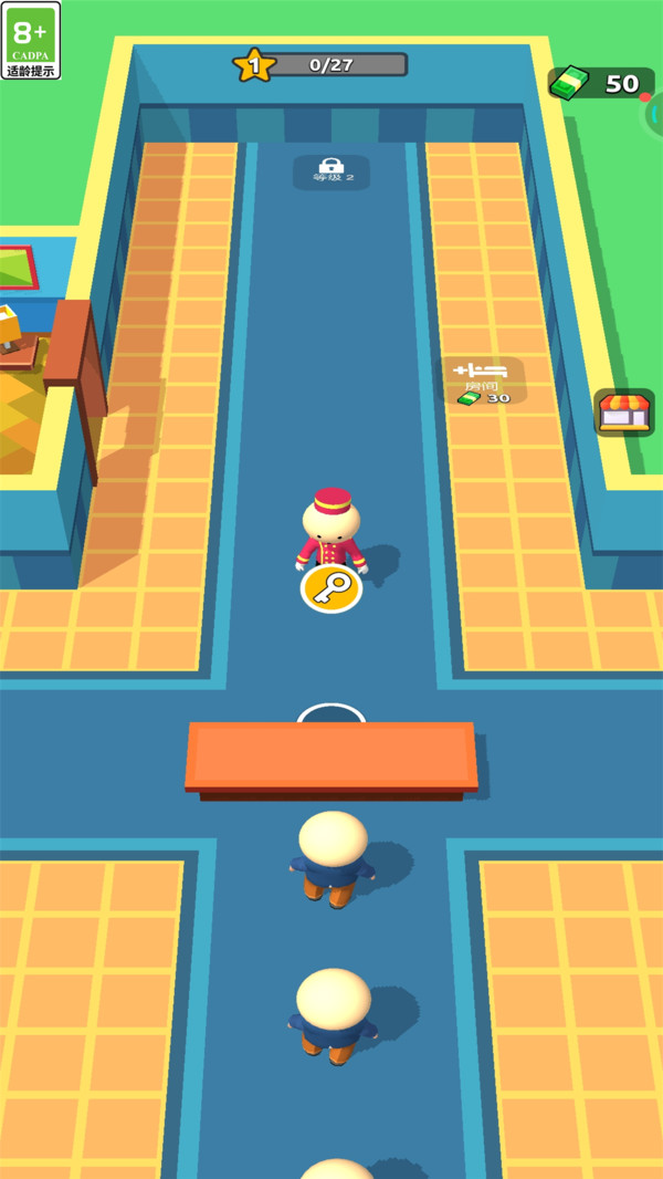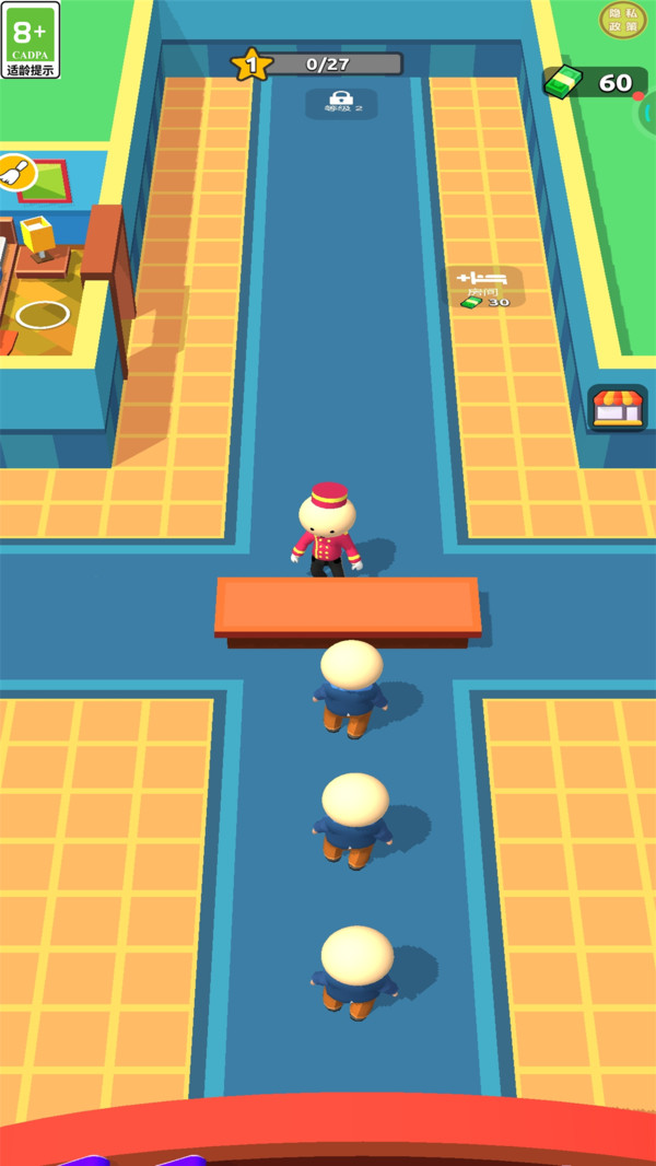 1、点击屏幕滑动控制你的酒店角色移动,在前台处接待顾客入住。
