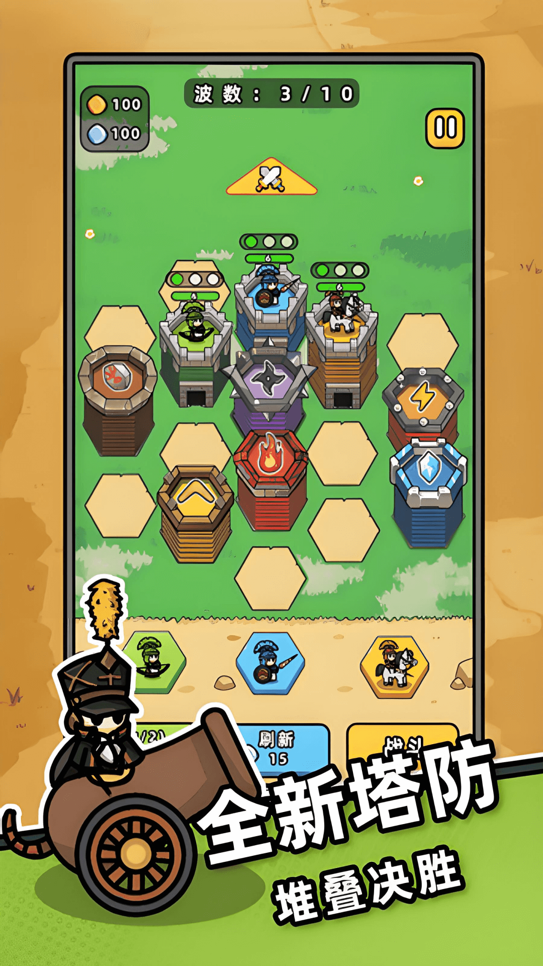 1、进入游戏,拖动小兵到格子里,相同的小兵会靠近叠加,达到数量之后会生成塔楼。