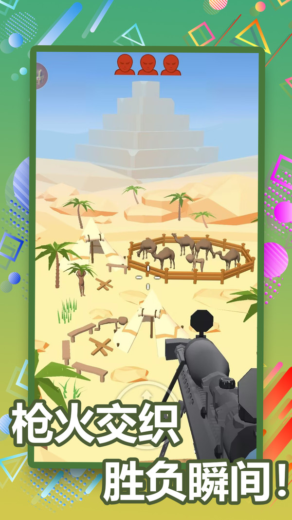 黄金枪手是一款瞄准敌人,开始射击作战的闯关游戏,游戏采用极简火柴人画风,玩家扮演身手矫健的狙击手,通过精准射击完成关卡目标,角色设计简洁但动作流畅,突出射击操作的爽快感,敌人会伪装成建筑物、树木、岩石等环境元素,玩家需通过观察细节识别目标,枪枪爆头,成为顶级神枪手。