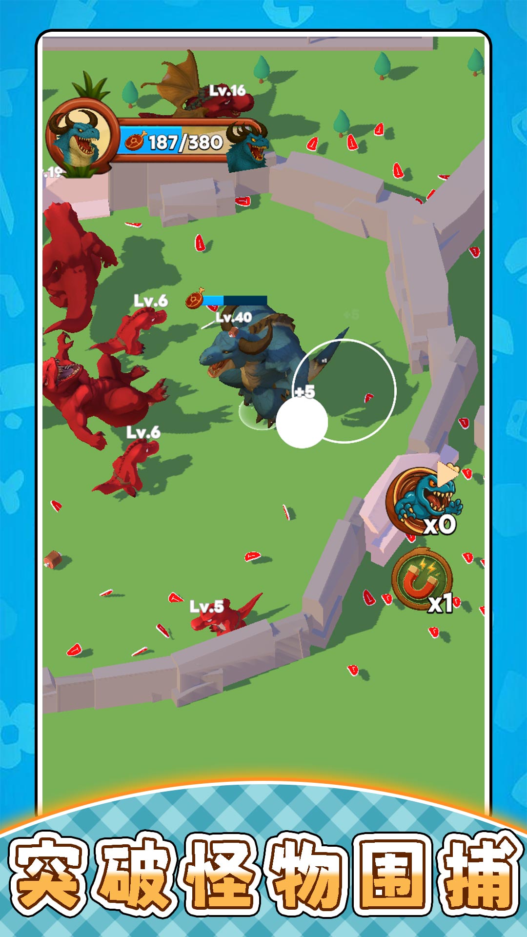 3、游戏中特设虚拟摇杆控制系统,让你精准操控恐龙的每一步移动,灵活穿梭于草地间,收集珍贵的肉块资源,助力恐龙快速成长。