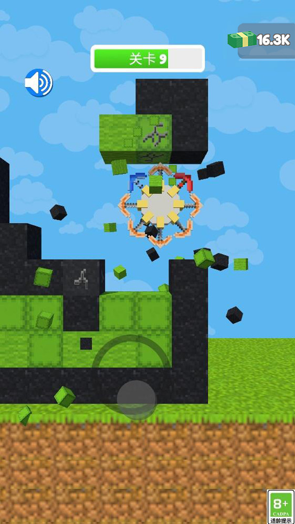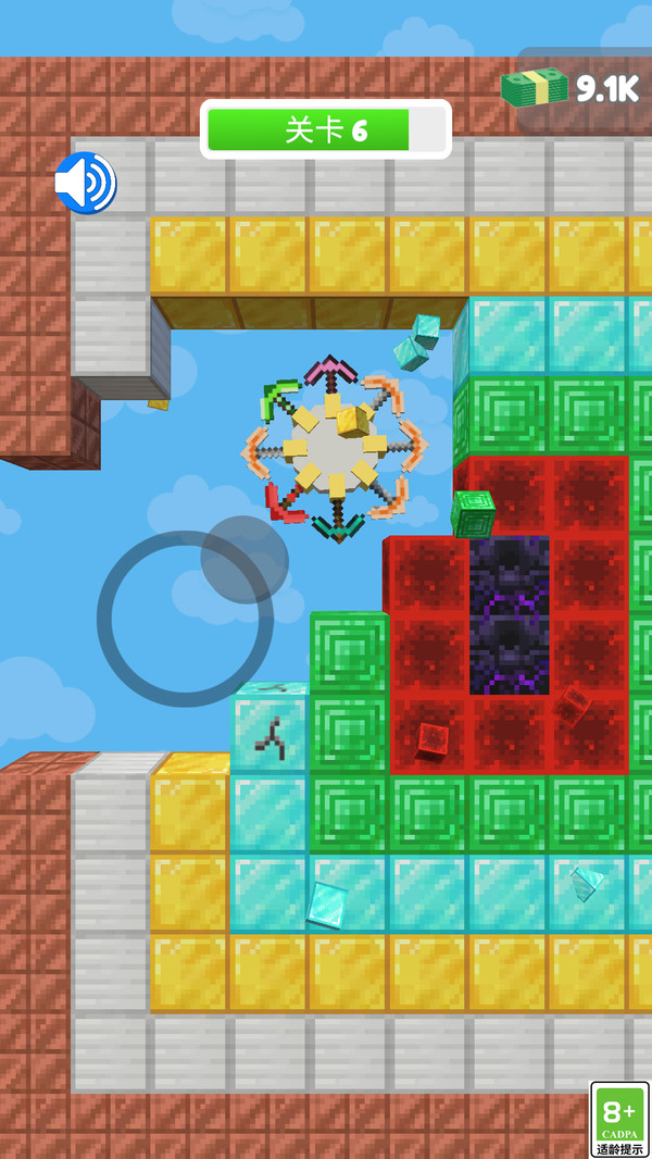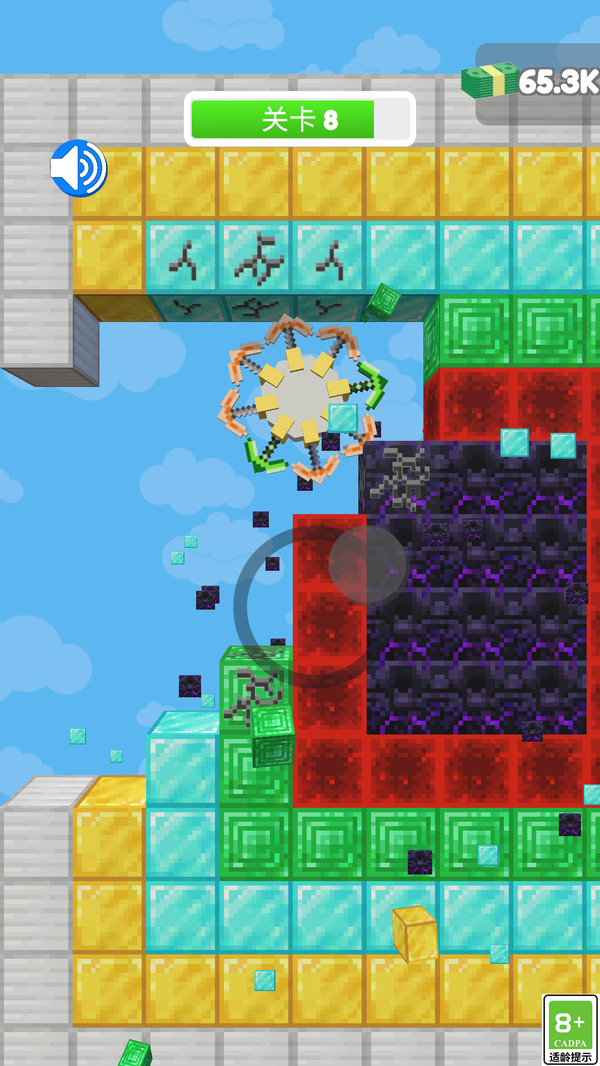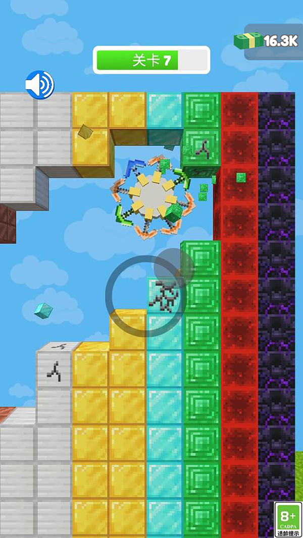 2、点击屏幕释放合并后的镐子,镐子自动下落击碎路径上的方块,合理规划镐子下落路径挖宝;