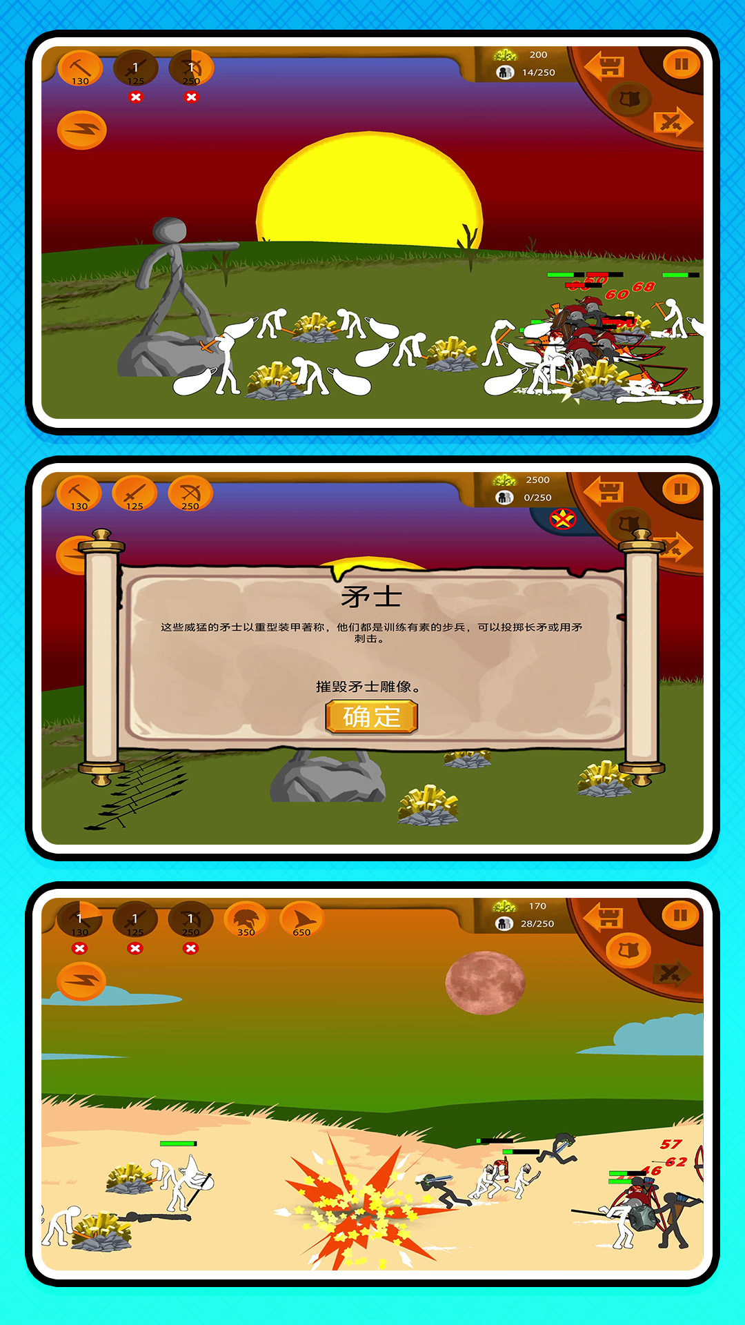 1、玩家可招募剑士、弓箭手、法师、巨人等20余种火柴人士兵,每个兵种拥有独特技能;