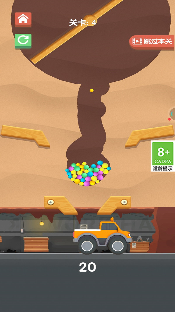 1、使用手指在屏幕上滑动,像刮沙画一样挖开泥土,为球球设计一条通往卡车的下滑路线。