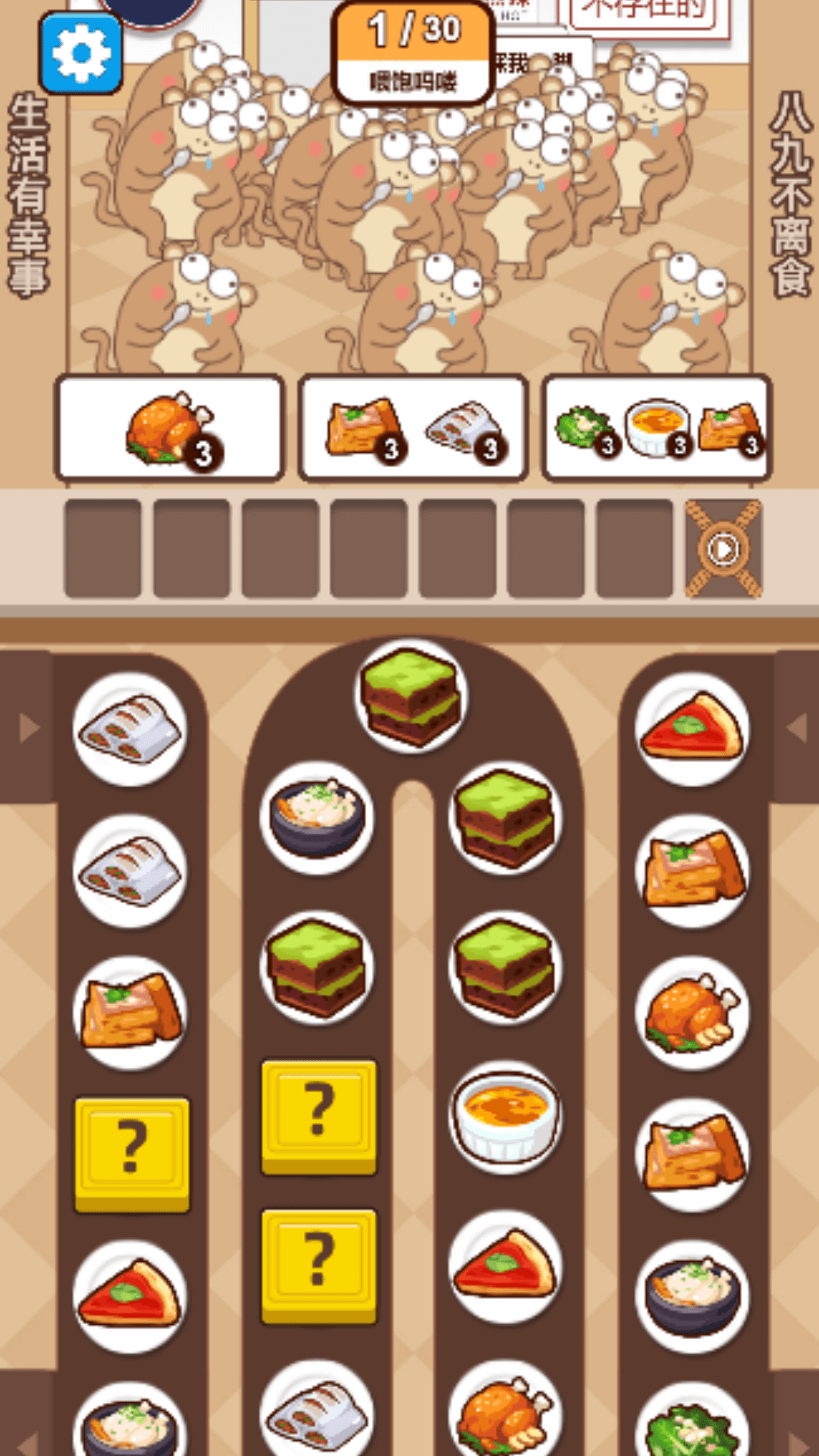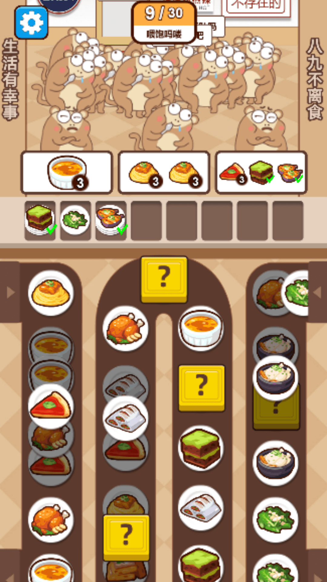 1、通过手指滑动旋转圆形托盘,调整菜品的位置以便形成三个或以上相同菜品的连线。