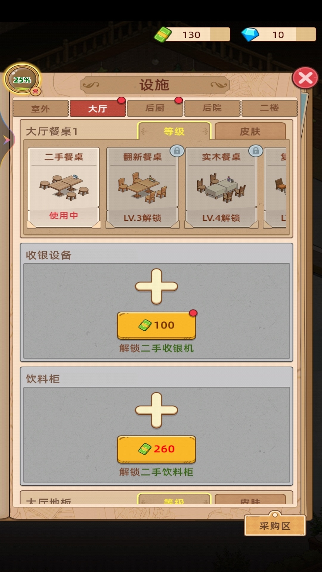 2、开始装修你的小屋,多个菜单供你选择,购买大量的桌椅凳子,接待不同的客人。