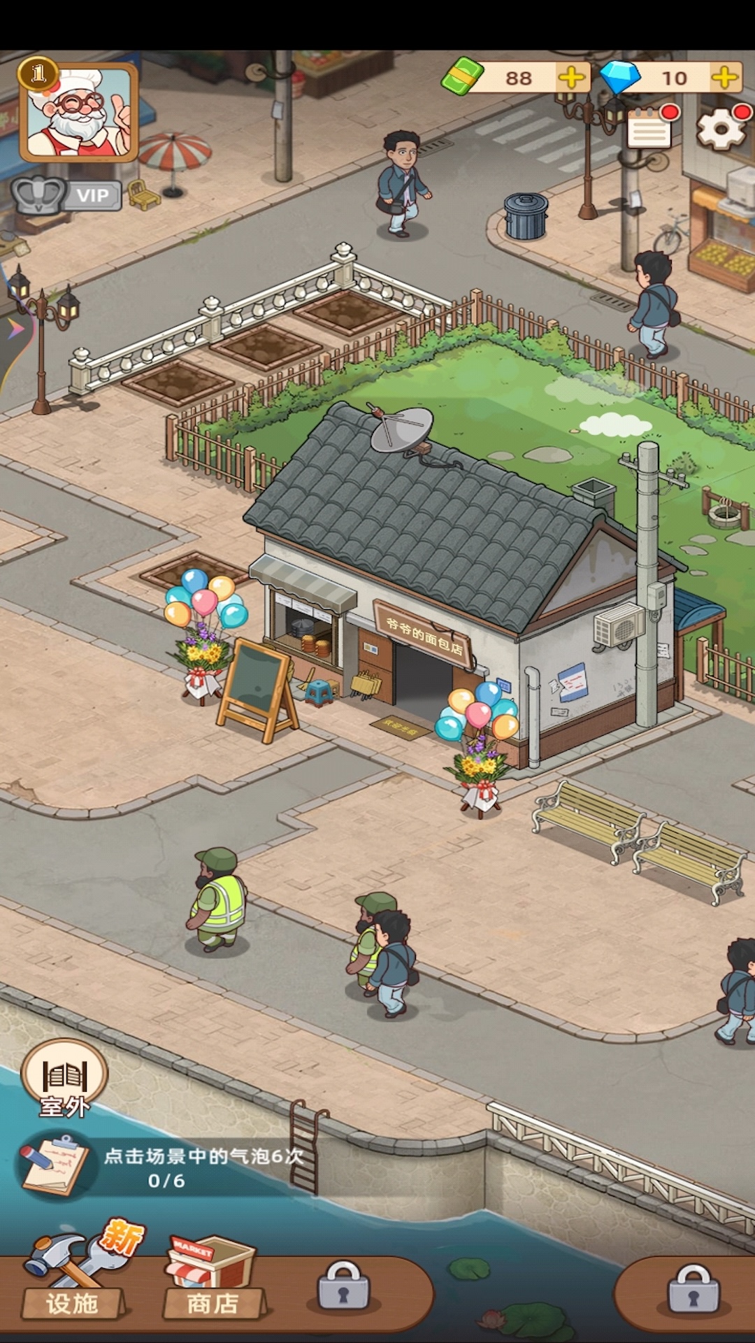 1、进入游戏,点击按钮粉刷爷爷的房屋,装修你的早餐店,进入店铺开始装修。