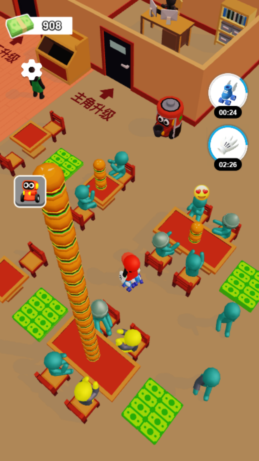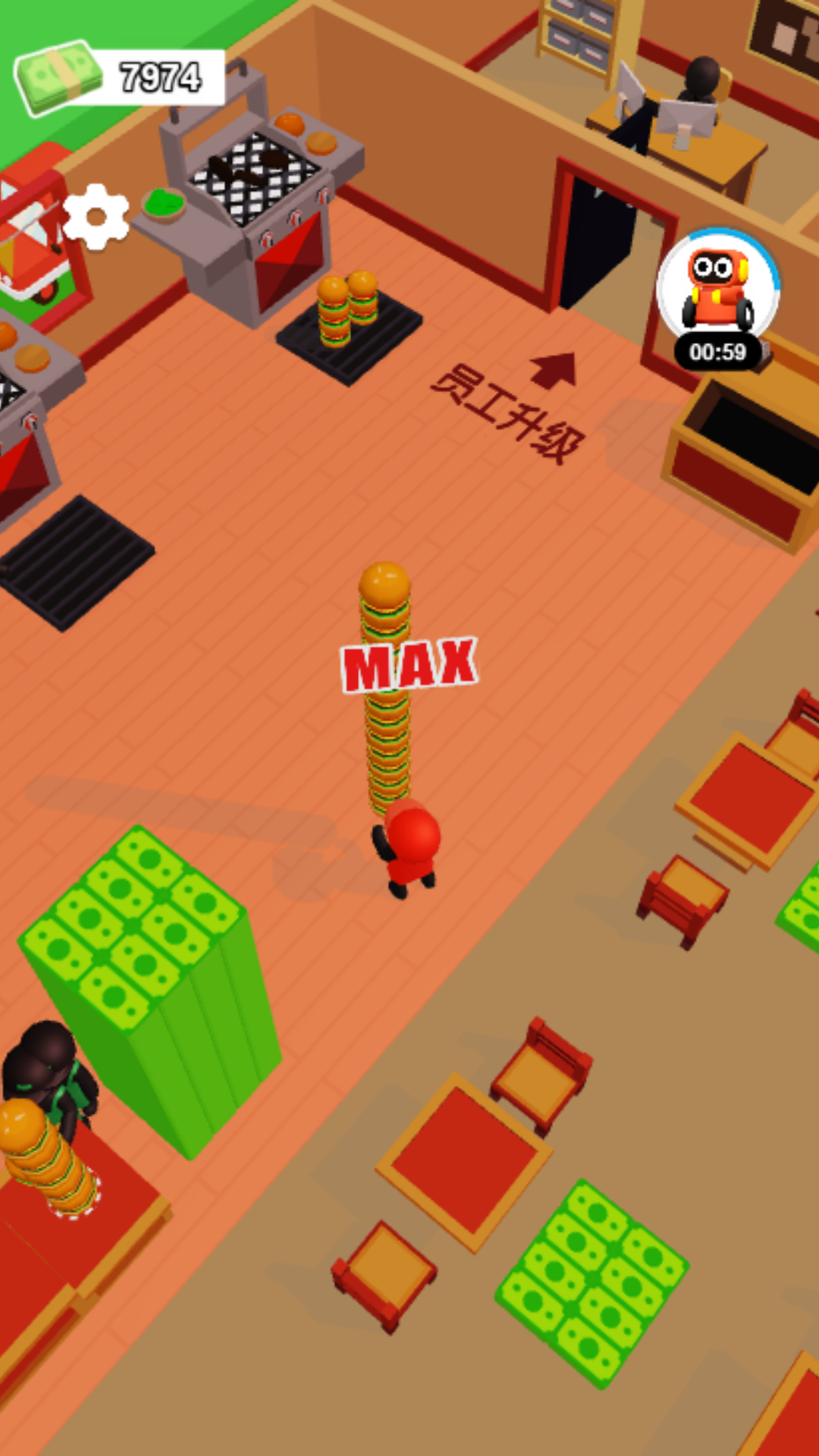 3、制作汉堡,拾取汉堡放在收银台上面,售卖汉堡获取丰富的奖励,清理桌子。