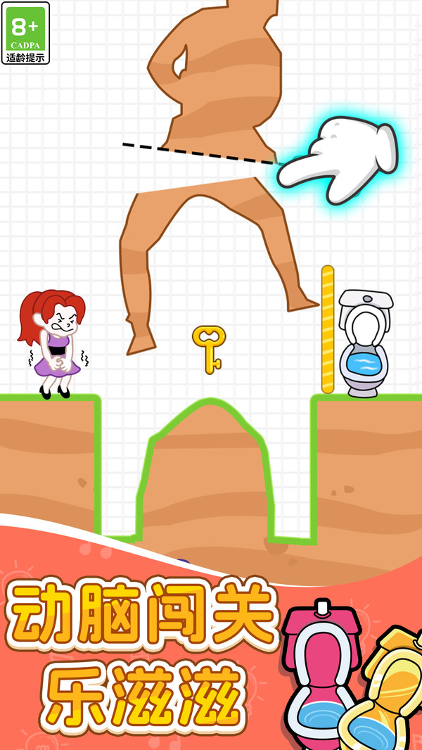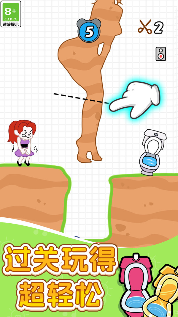 3、通过精准画线切割物体,使其下落并填充道路,形成一条连接小女孩与终点厕所的可行路径。