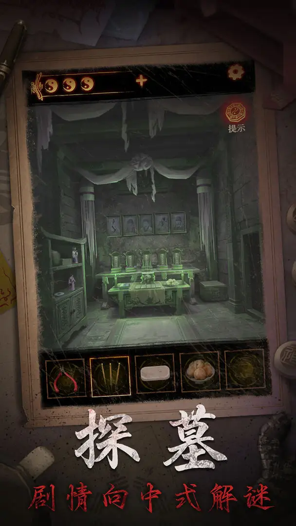 1、在古墓场景中自由探索,点击互动拾取道具、触发机关,并将物品组合或用于特定位置解谜。