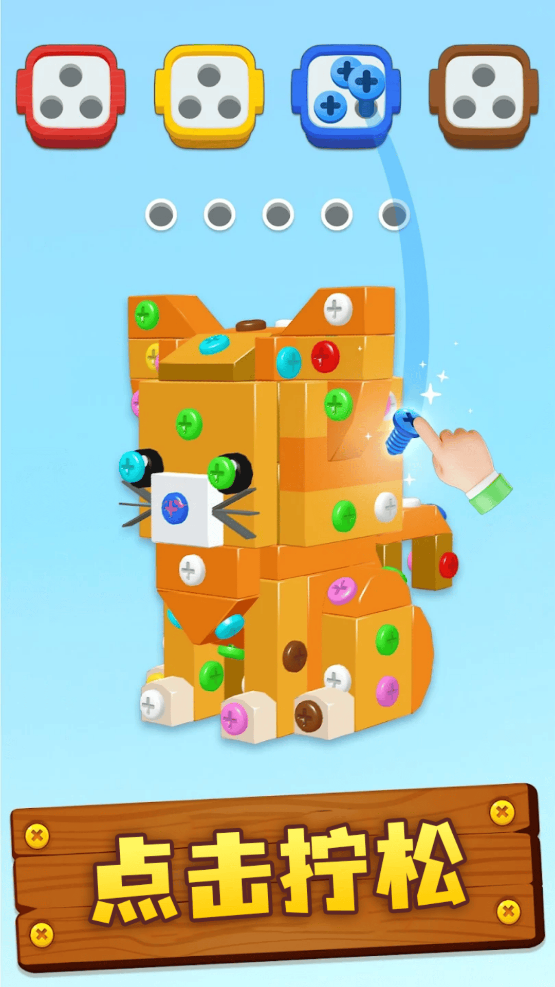 3、点击螺丝将其拧出,拖入对应颜色盒子,若螺丝被遮挡,需先移动或拆除遮挡物。