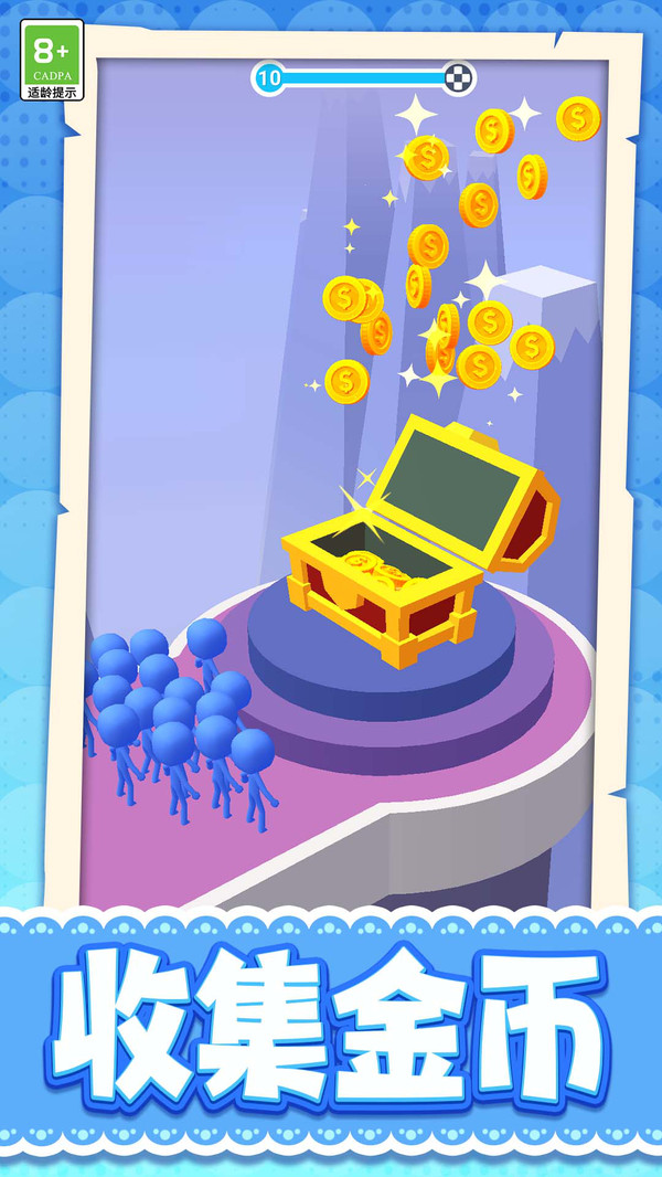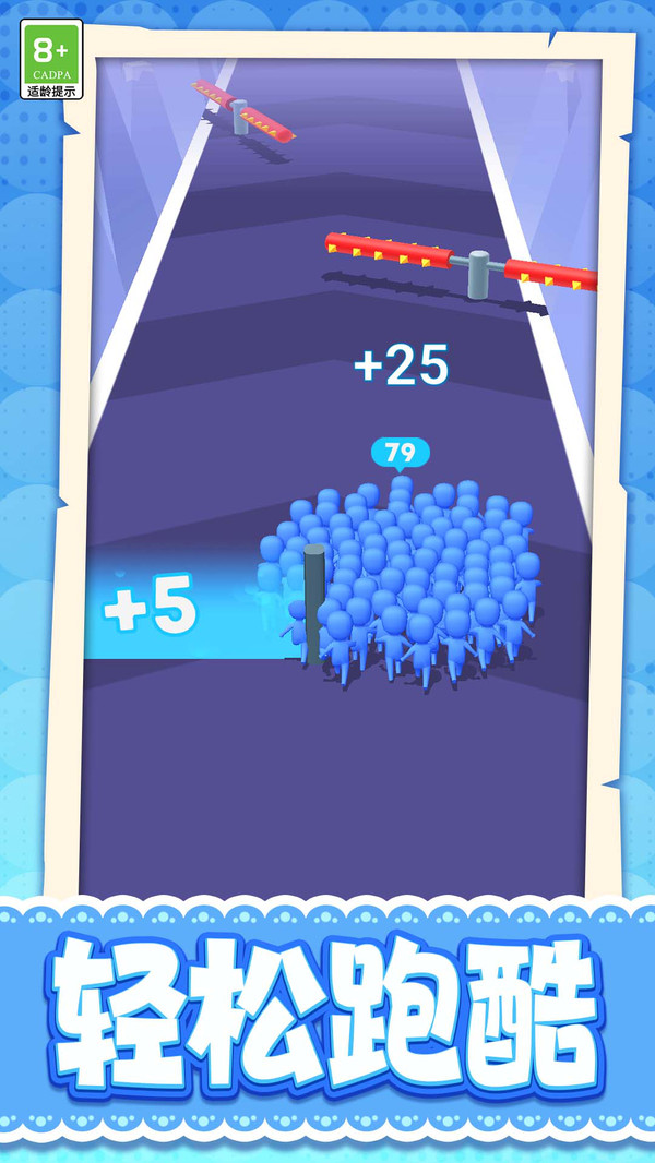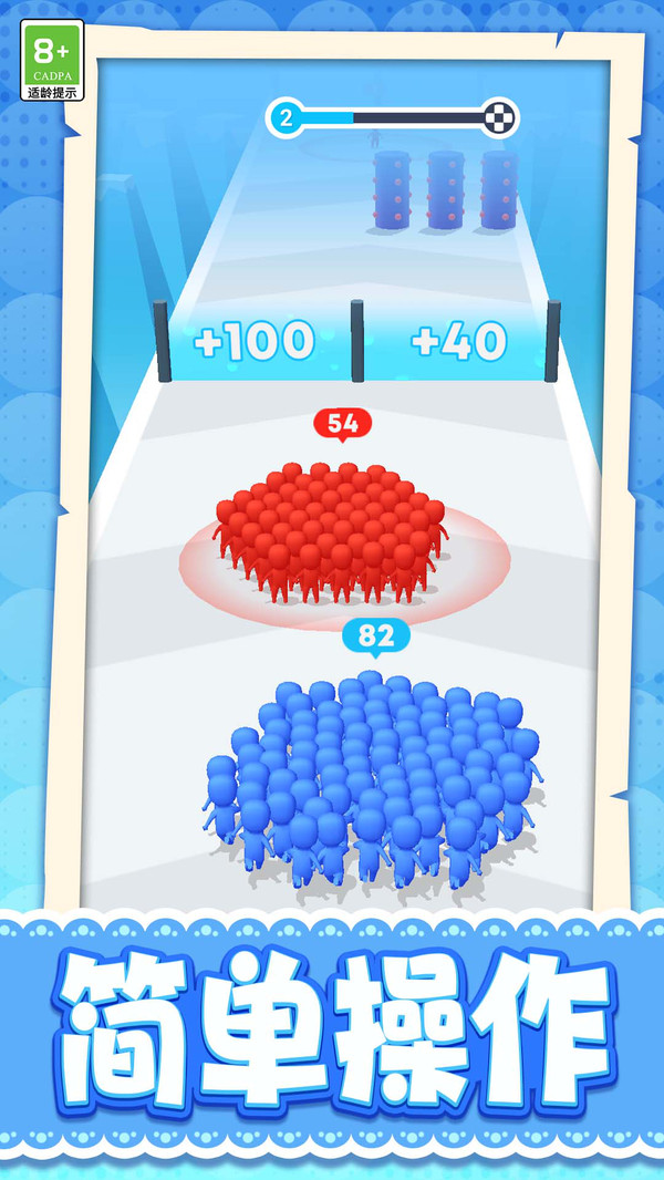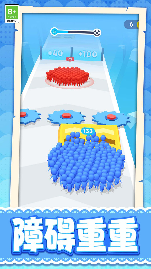 1、点击屏幕左右滑动,控制角色移动,在场景中不断的成长更多的人数。