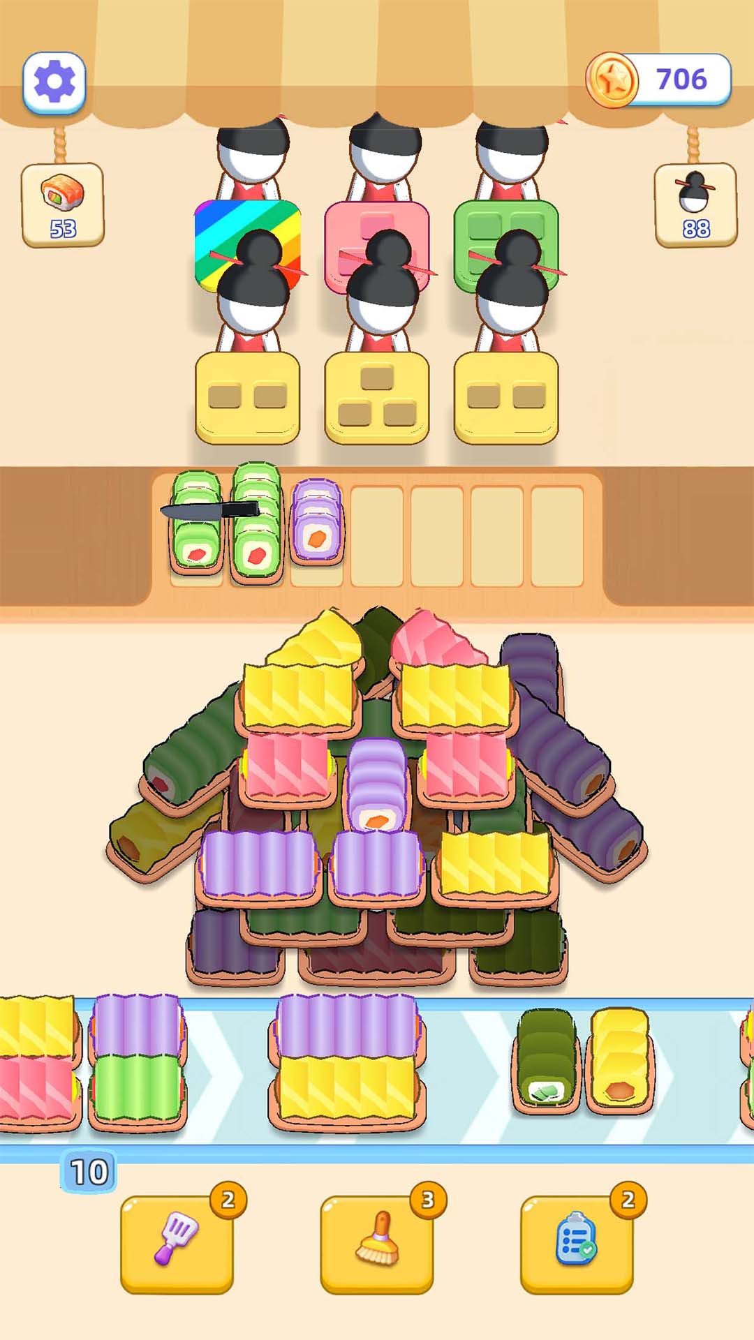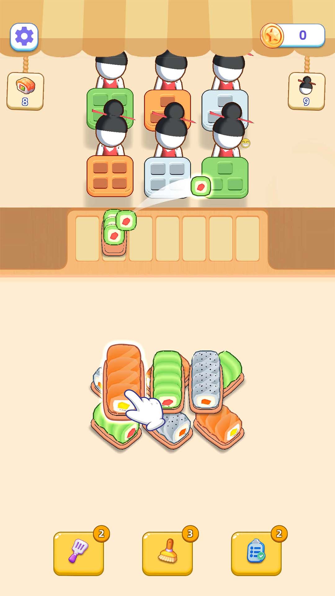 1、多种寿司和对应颜色的客人等你来匹配,后期还会出现穿着混合颜色服装的挑剔客人。