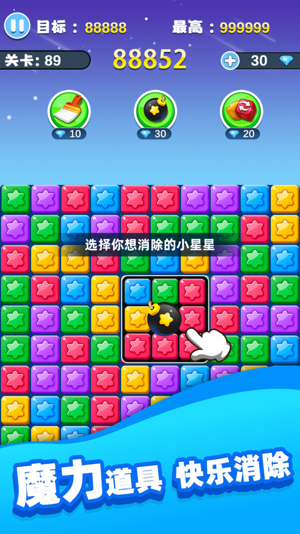 2、提供彩虹星星消除同色所有星星,爆炸星星消除周围区域、交换道具等特殊工具,帮助玩家突破难点。