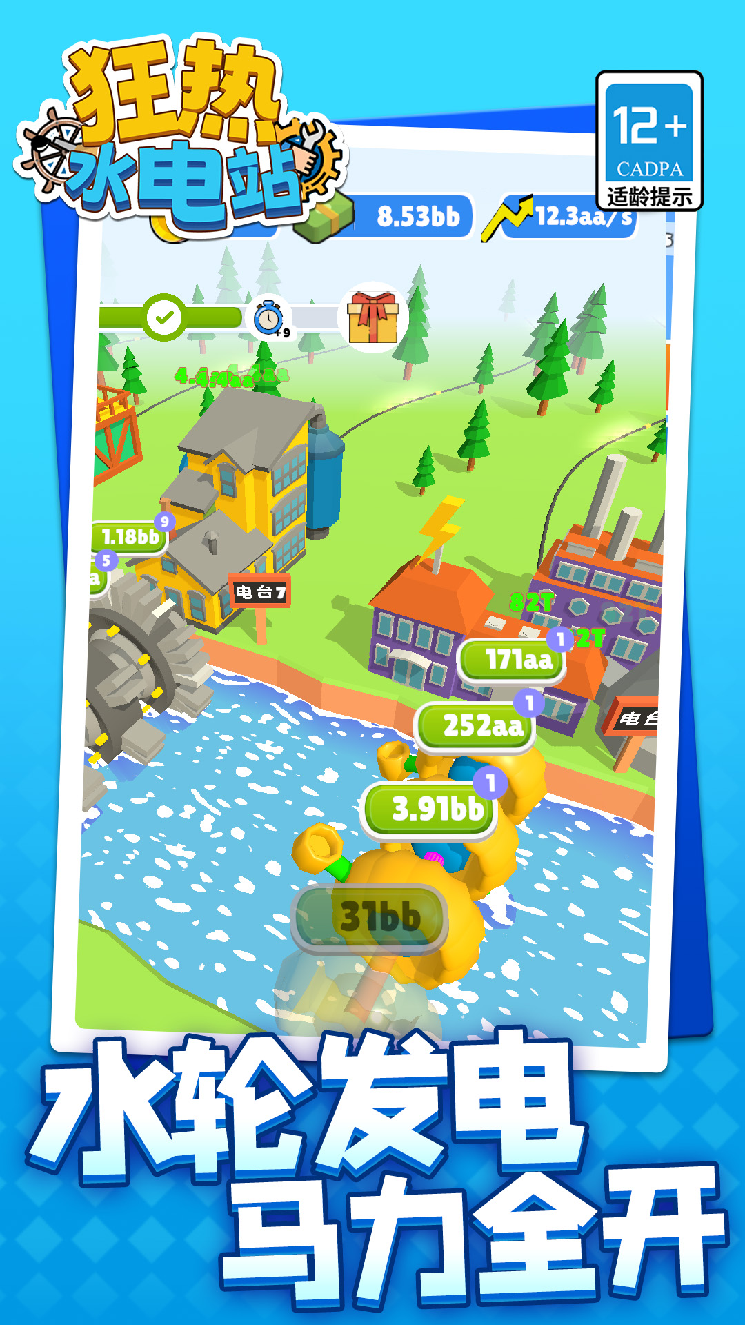 1、升级水车承重、涡轮效率等,提升单机发电量,解锁更高效的发电机型号,增加电力输出;