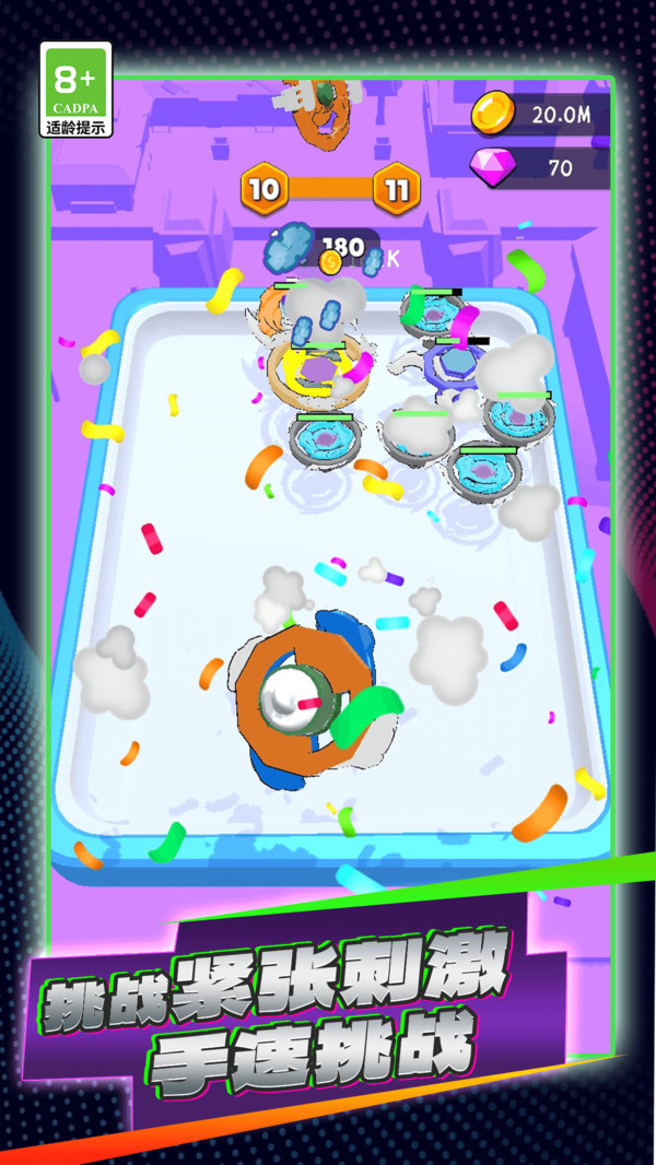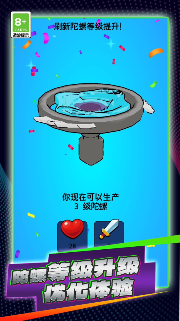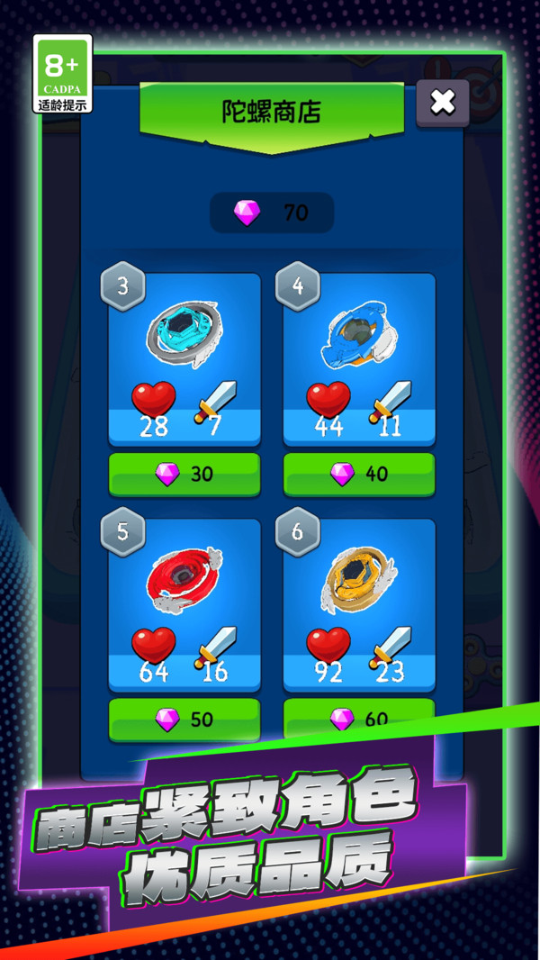 陀螺斗技场是一款以陀螺对战为核心的动作闯关游戏,采用高精度物理模拟技术,陀螺的旋转、碰撞、弹跳轨迹均符合真实物理规律,玩家需通过精准控制陀螺的发射角度、力度及移动轨迹,利用撞击将对手击出竞技场或破坏其平衡,操作反馈直接且富有层次感,精彩的格斗,成为顶级的陀螺大王。