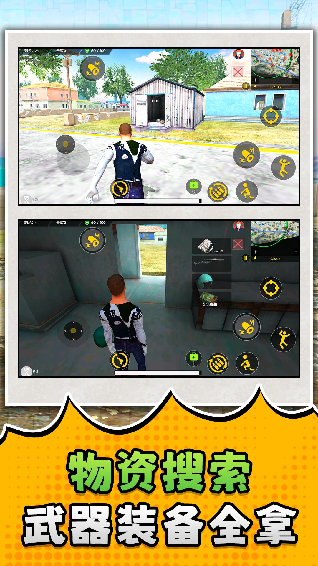 2、游戏伊始你将从天而降,迅速寻找安全着陆点,落地后立即投入紧张的物资收集,从武器弹药到防护装备,每一件都关乎你的生死存亡。