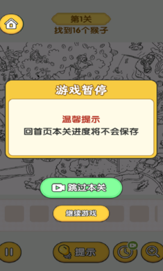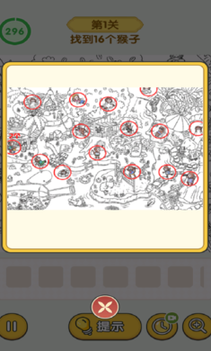 2、从第一关开始挑战,需要找到16个猴子,直接点击屏幕即可;
