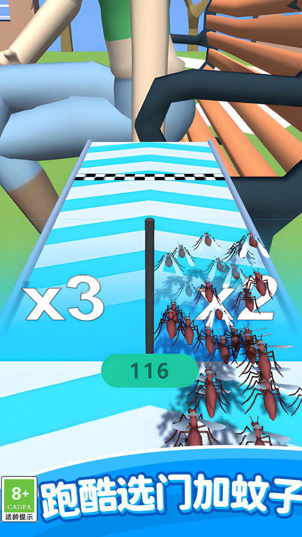 1、在游戏关卡中,玩家只需要左右滑动,控制你的蚊子大军左右移动成长。