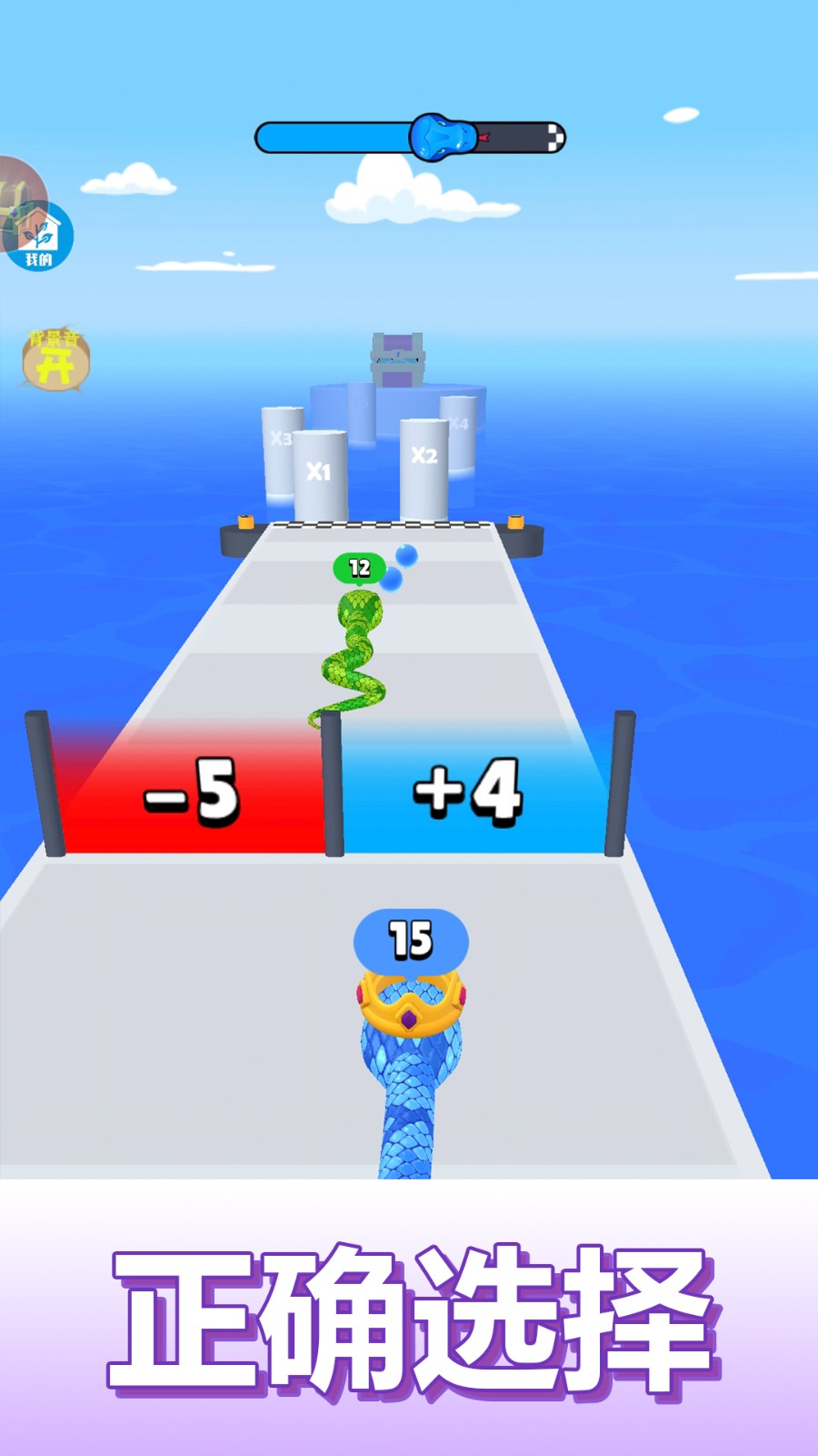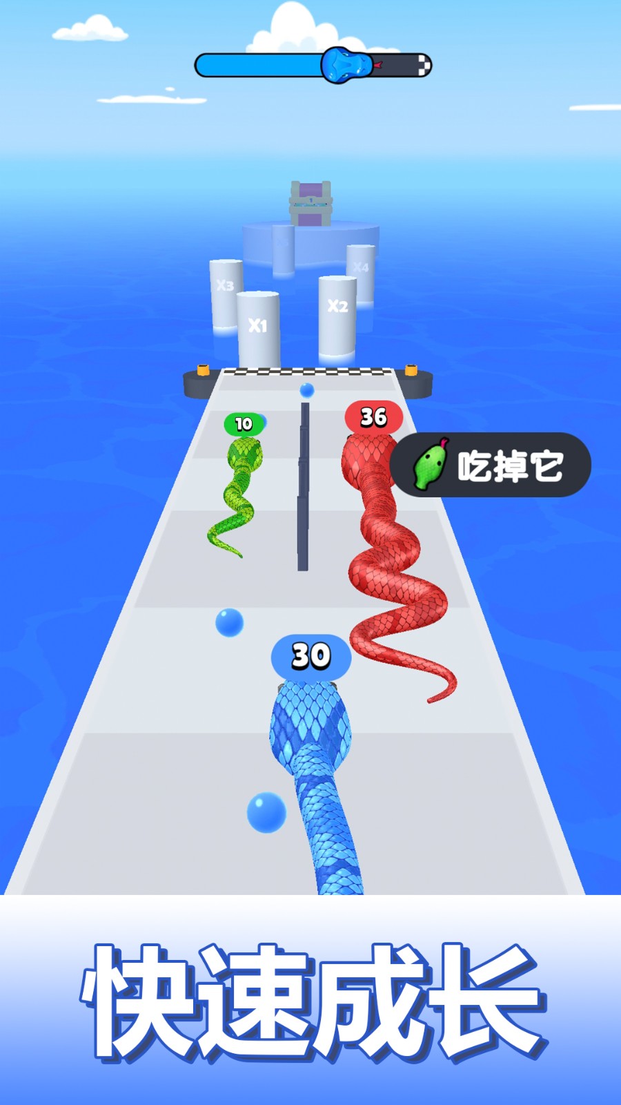 2、逐渐熟悉各类赛道特性与障碍设置规律,控制蛇蛇在关卡里不断进化变强。