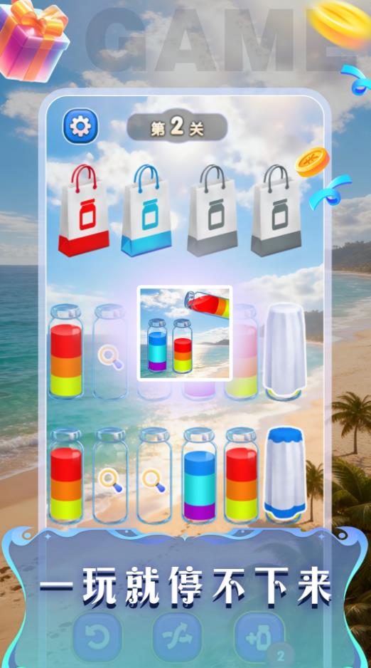 1、每一关都是全新的谜题,颜色数量、瓶子容量、布局结构千变万化,保证持续的新鲜感。